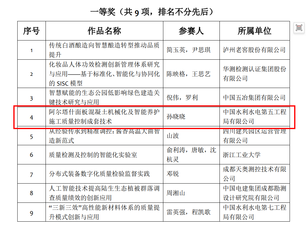 11月(yue)7日,第(di)一屆(jie)全國質量創新案例決(jue)賽在浙(zhe)江(jiang)杭州召開,來自全國42家單位的49支(zhi)參(can)(can)賽隊伍代表(biao)參(can)(can)加啟動儀式(shi)。《阿爾塔(ta)什面板混凝土(tu)機械化及(ji)智(zhi)能養護施(shi)工(gong)質量控制成套技(ji)術(shu)》獲得一等獎。