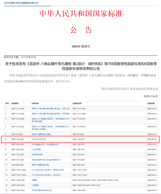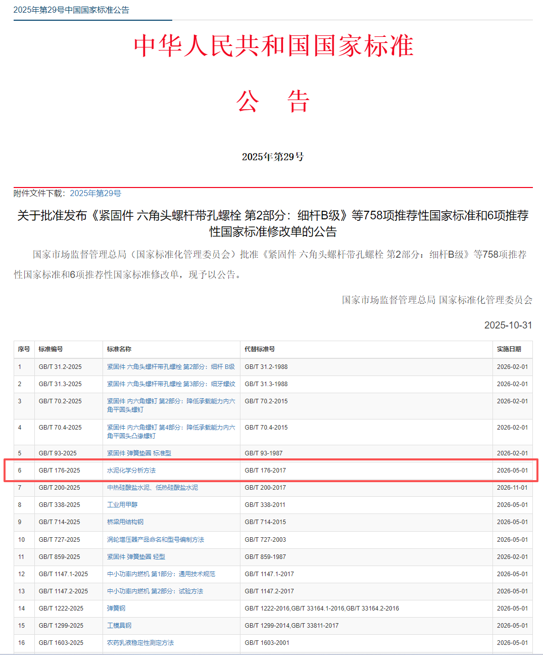 日前,國家市場監督管理總局(國家標準化管理委員會)正式批準發布758項推薦性國家標準。公司深度參與編制的《水泥化學分析方法》標準位列其中,標志著公司在水泥質量檢測領域的技術積淀與行業影響力獲得權威認可。