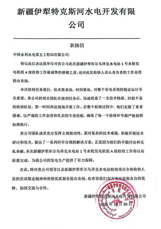 新疆伊犁特克斯河水電開發有限公司表揚信