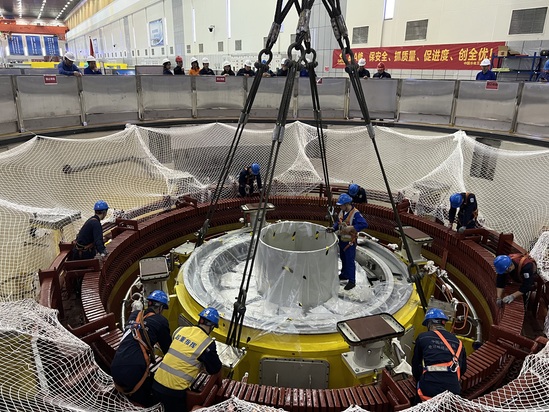 11月9日,隨著現場起重總指揮一聲清脆的哨響,重達73噸的龐然大物——溧陽抽水蓄能電站6號機組發電機下機架,在橋式起重機的牽引下平穩升起,經過精準地移動、調整后,穩穩落入機坑預定位置。此舉標志著由制安公司檢運公司承修的溧陽電站6號機組A級檢修工作中的又一個關鍵里程碑節點順利完成,為后續發電電動機回裝工作奠定了堅實基礎。