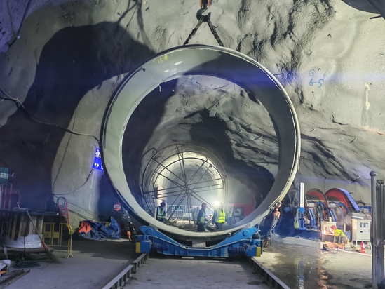 本次安裝的壓力鋼管位于直徑5.6米的下斜井段,是電站引水系統的核心組成部分。安裝過程中,項目部制定了周密的專項施工方案。首先,采用“平板卡車+天錨+軌道運輸臺車”的組合方式進行鋼管水平與斜井運輸。精準運抵安裝位置后,操作人員使用千斤頂將鋼管頂升,并利用焊接托板等工藝措施,安全退出運輸臺車。隨后,通過螺旋千斤頂精細調整鋼管的中心、高程及傾斜度,遵循“先粗調后精調”的原則,在各項位置參數完全符合設計要求后,立即進行加固焊接,確保安裝穩固。