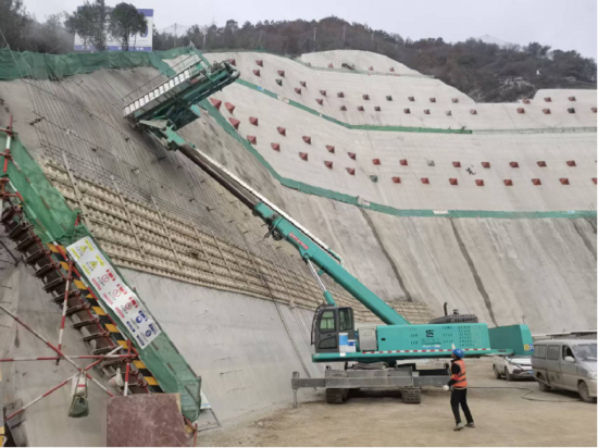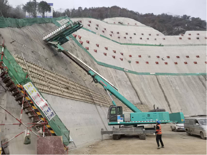針對大型設備的視線盲區,項目部裝設了高靈敏度紅外線感應報警器,配備智能語音播報模塊與高分貝聲光報警器。當監測到行人、機具進入危險區域時,設備立即發出“盲區危險,請勿靠近”的語音提示,從源頭杜絕機械傷害事故。在高邊坡施工中,高臂臺車進行邊坡錨桿、掛網作業,天泵改造的濕噴車替代了傳統的人員噴護作業方式,既減少了作業人員數量,又大幅提升本質安全水平。