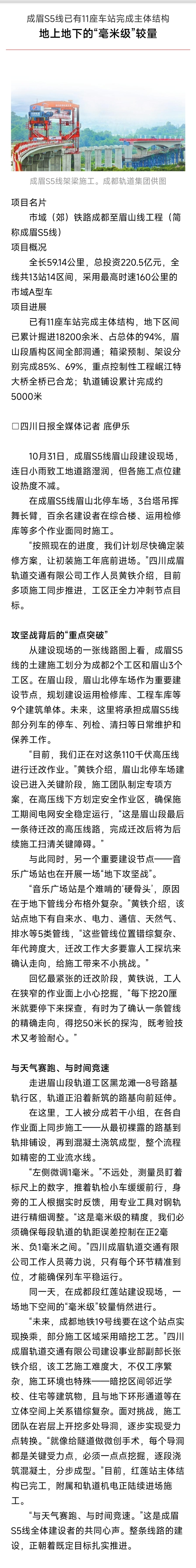 “與天氣賽跑、與時間競速。”這是成眉S5線全體建設者的共同心聲。整條線路的建設,正朝著既定目標扎實推進。
