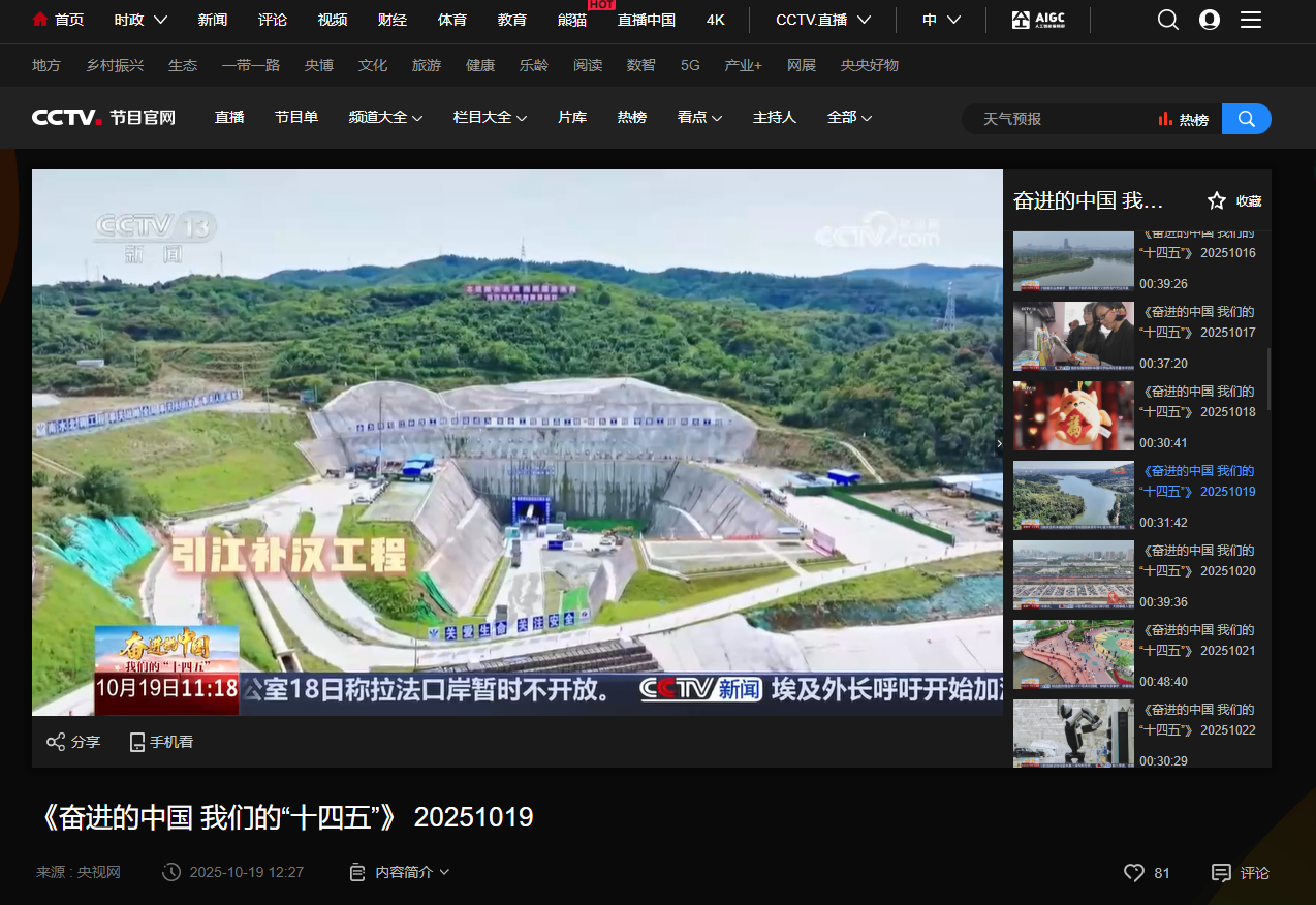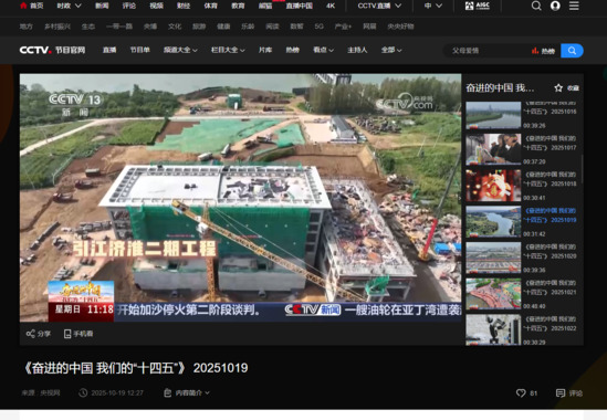 2025年是“十四五”收官之年,10月19日,央視新聞專題欄目《水潤華夏 治水興邦》,對五局參建的引江補漢工程、引江濟淮二期工程等多個項目的建設歷程與綜合效益進行了詳細報道。