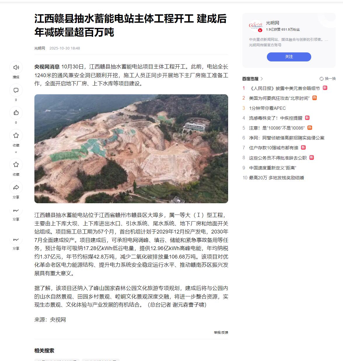 央視網消息?10月30日,江西贛縣抽水蓄能電站項目主體工程開工。此前,電站全長1240米的通風兼安全洞已順利開挖,施工人員正同步開展地下主廠房施工準備工作,全面開啟地下廠房、上下水庫等項目建設。