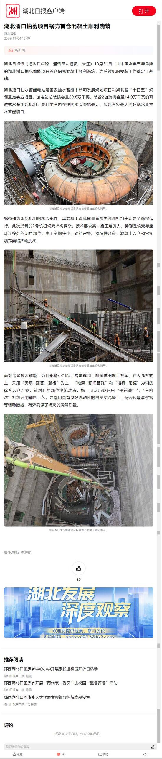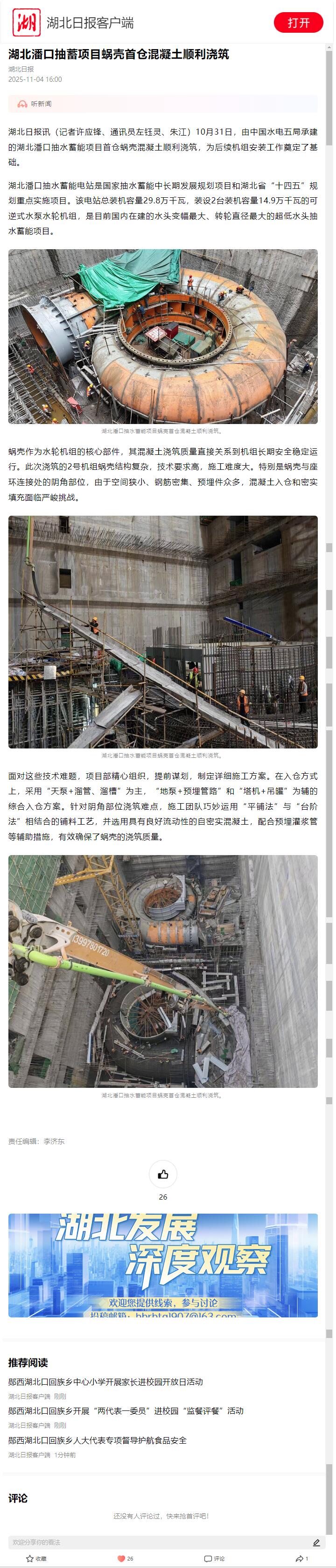 湖北日報訊(記者許應鋒、通訊員左鈺靈、朱江)10月31日,由中國水電五局承建的湖北潘口抽水蓄能項目首倉蝸殼混凝土順利澆筑,為后續機組安裝工作奠定了基礎。 湖北潘口抽水蓄能電站是國家抽水蓄能中長期發展規劃項目和湖北省“十四五”規劃重點實施項目。該電站總裝機容量29.8萬千瓦,裝設2臺裝機容量14.9萬千瓦的可逆式水泵水輪機組,是目前國內在建的水頭變幅最大、轉輪直徑最大的超低水頭抽水蓄能項目。 湖北潘口抽水蓄能項目蝸殼首倉混凝土順利澆筑。 蝸殼作為水輪機組的核心部件,其混凝土澆筑質量直接關系到機組長期安全穩定運行。此次澆筑的2號機組蝸殼結構復雜,技術要求高,施工難度大。特別是蝸殼與座環連接處的陰角部位,由于空間狹小、鋼筋密集、預埋件眾多,混凝土入倉和密實填充面臨嚴峻挑戰。 湖北潘口抽水蓄能項目蝸殼首倉混凝土順利澆筑。 面對這些技術難題,項目部精心組織,提前謀劃,制定詳細施工方案。在入倉方式上,采用“天泵+溜管、溜槽”為主,“地泵+預埋管路”和“塔機+吊罐”為輔的綜合入倉方案。針對陰角部位澆筑難點,施工團隊巧妙運用“平鋪法”與“臺階法”相結合的鋪料工藝,并選用具有良好流動性的自密實混凝土,配合預埋灌漿管等輔助措施,有效確保了蝸殼的澆筑質量。