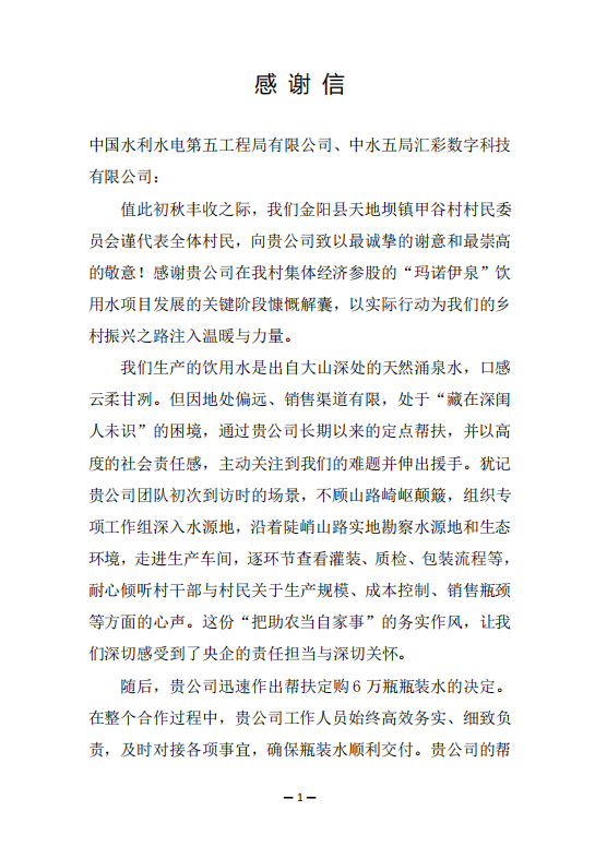 9月15日,中國水電五局匯彩科技收到了來自涼山彝族自治州金陽縣天地壩鎮甲谷村村民委員會的感謝信,信中對匯彩科技在礦泉水產業幫扶項目中給予的大力支持表示衷心感謝。