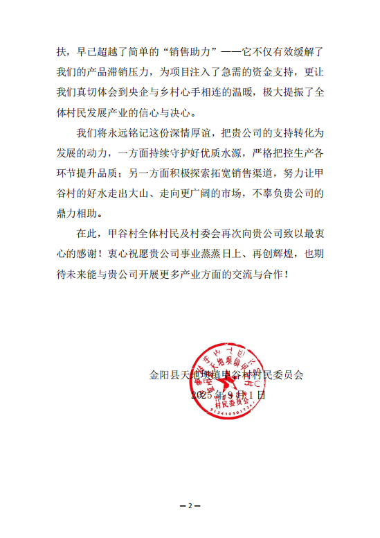 金陽縣天地壩鎮甲谷村村民委員會專門發來感謝信,對匯彩科技的鼎力支持表示衷心感謝。信中提到,團隊不顧山路崎嶇,深入水源地實地勘察,走進生產車間全程跟進生產流程,并以“把助農當自家事”的務實作風,中國水電五局迅速作出定購6萬瓶瓶裝水的幫扶決定,有效緩解了產品滯銷壓力,為項目注入資金支持,極大提振了村民發展產業的信心。村委會表示,將把這份支持轉化為發展動力,持續提升產品品質、拓寬銷售渠道,努力讓甲谷村的好水走出大山、走向更廣闊的市場。