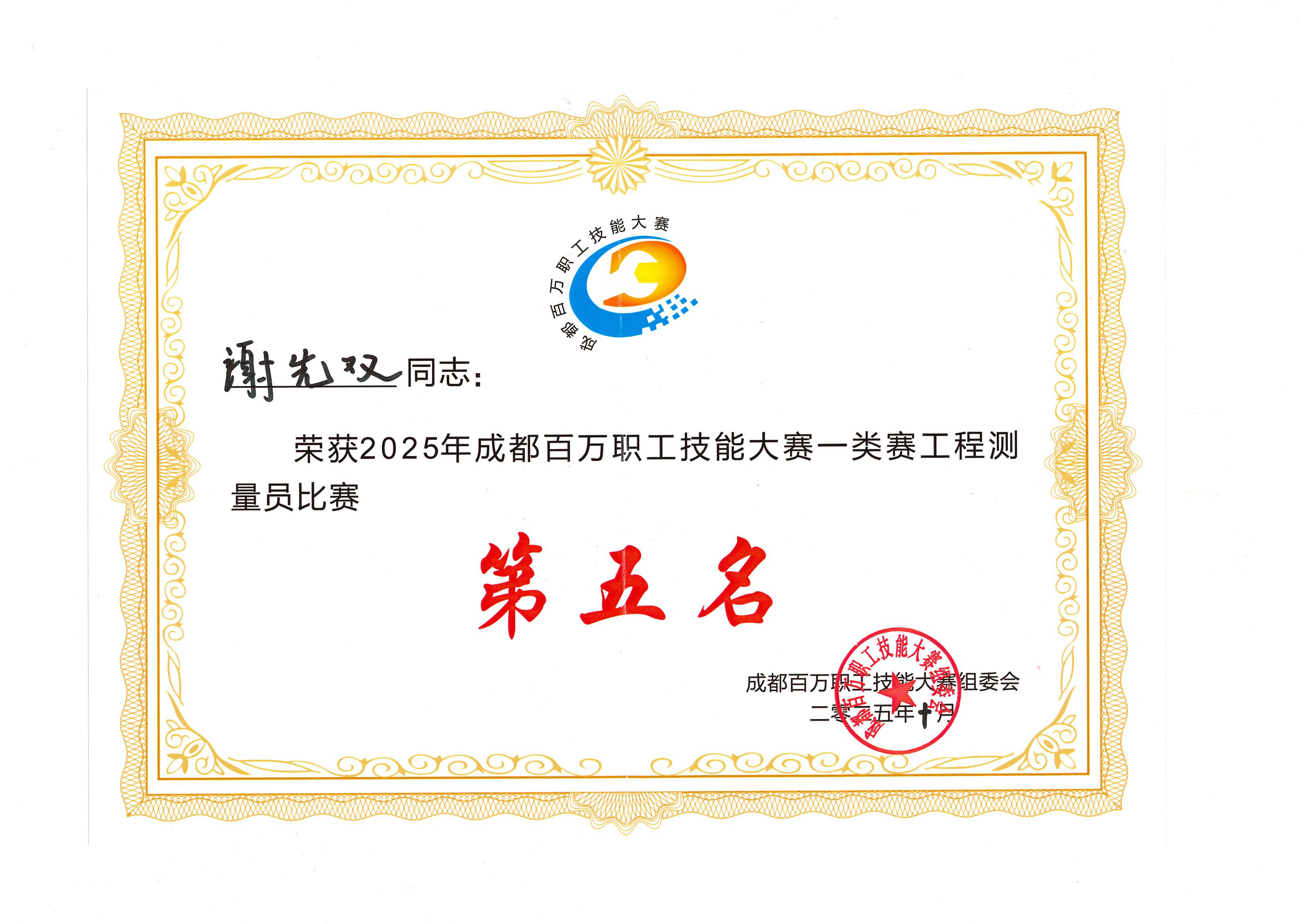 10月22日至24日,由成都市總工會、成都市人力資源和社會保障局主辦的2025年成都百萬職工技能大賽工程測量員比賽圓滿落幕。水電五局一公司測量大隊謝先雙憑借扎實的專業素養與穩定的現場發揮,在來自成都市37家單位、近百名測量技能人才的同臺競技中脫穎而出,最終榮獲個人第五名的優異成績。