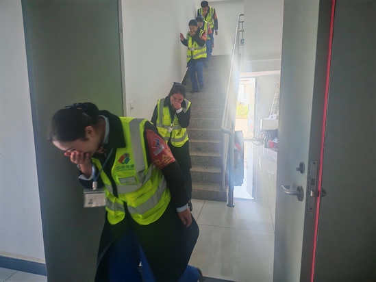 建(個)元項目團支部組織專題消防安全知識宣講。站管人員結合近期典型火災案例,講解收費站工作區、生活區用火用電的常見風險、火災預防的基本措施、初期火災的撲救方法以及火場逃生自救技巧。理論宣講結束后,現場組織了實戰演練。演練模擬辦公樓內因電器短路引發火情的場景。隨著警報響起,應急疏散預案立即啟動,全體員工在疏導員的指引下,彎腰低姿、用濕毛巾捂住口鼻,沿著預定疏散路線迅速、有序地撤離至安全地帶。