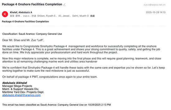 10月29日,沙特國王港項目P4包收到業主阿美表揚信,具體內容翻譯如下: