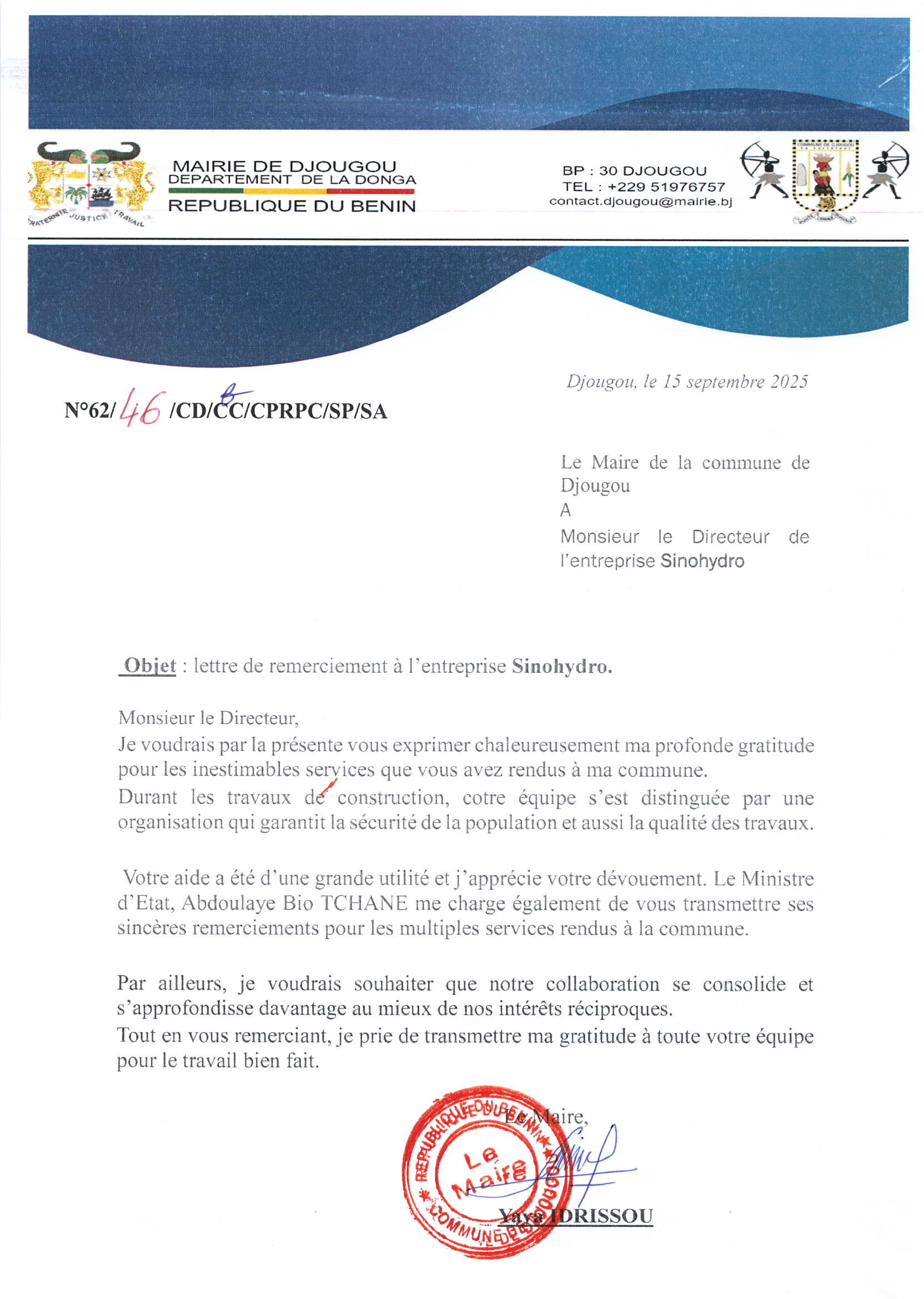 在感謝信中,朱古市市長Yava IDRISSOU先生轉達了國務部長Abdoulaye Bio TCHANE先生對項目部團隊克服困難、優質履約的感謝。