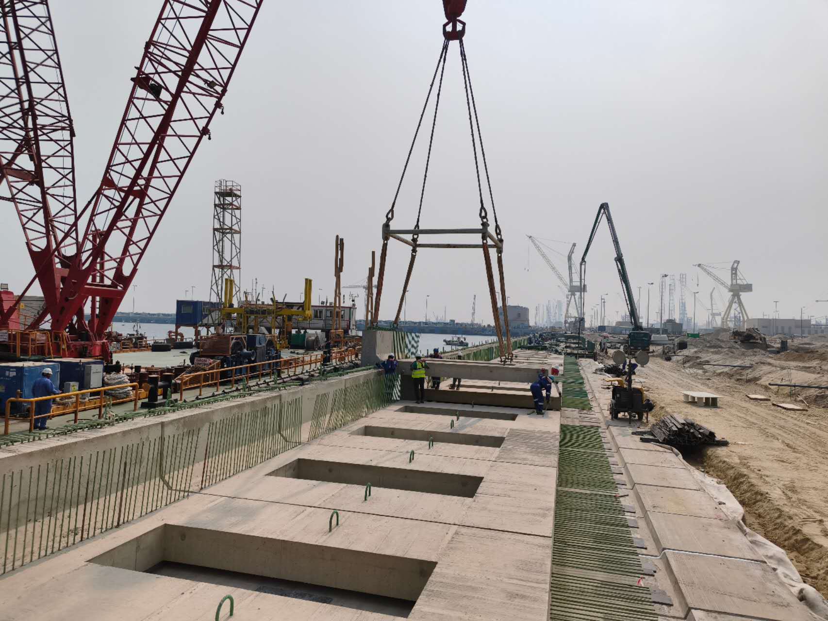 三號碼頭墻延(yan)伸段位于二號干(gan)船(chuan)塢南側,總長度123米,是(shi)國王(wang)港(gang)重要的(de)防護(hu)與(yu)承重結構之(zhi)一。本次共安(an)裝(zhuang)(zhuang)胸墻預制件31塊,涵蓋4種規格,單(dan)塊最重達53噸,安(an)裝(zhuang)(zhuang)間距40毫米,對(dui)施(shi)(shi)工精度要求極高(gao)。項目自11月(yue)8日啟動,僅用3天即順利完成全部(bu)安(an)裝(zhuang)(zhuang)任務,施(shi)(shi)工進展高(gao)效有序。
